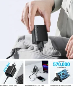Anker Şarj Cihazı 336 Powerport 67W Yüksek Hızlı USB-C Şarj – PowerIQ 3.0 ve ActiveShield – Siyah –