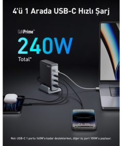 Anker Prime 749 240W 4 Port GaN Şarj Cihazı – USB-C Hızlı Telefon Tablet Macbook Masa Üstü Şarj Aleti + 240W Type-C Şarj Cihazı