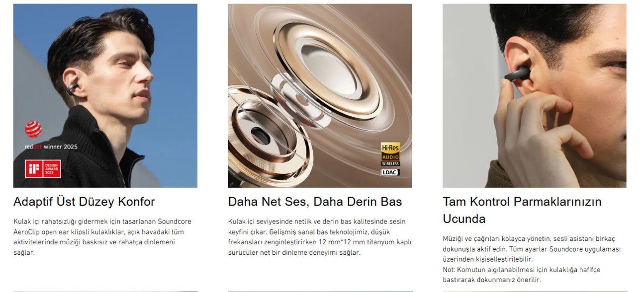 Kulak içi rahatsızlığı gidermek için tasarlanan Soundcore AeroClip open ear klipsli kulaklıklar, açık havadaki tüm aktivitelerinde müziği baskısız ve rahatça dinlemeni sağlar.