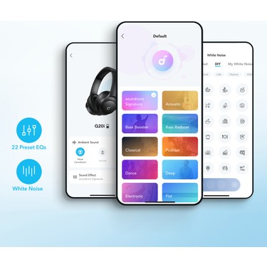 Soundcore uygulamasında özelleştirilebilir EQ ile dinleme deneyiminizi kişiselleştirin, rahatlama için beyaz gürültü gibi özelliklerle daha fazla keyif alın.