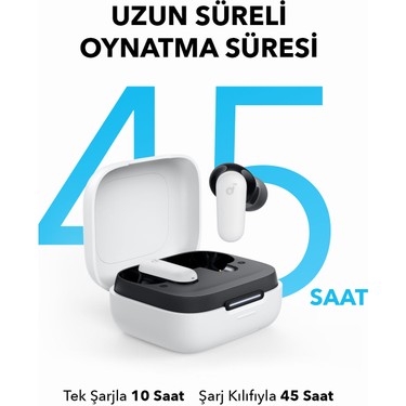 Tek şarjla 10 saat dinleme süresi sunan Soundcore R50i NC, şarj kılıfıyla bu sürenin 45 saate kadar uzanmasını sağlar. Zamanınız kısıtlı olduğunda, 10 dakikalık hızlı şarj ile 2 saatlik oynatma süresi elde edebilirsiniz.