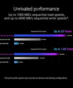 ROG Strix SQ7, 7000 Mb/s’ye varan sirali okuma hizi ve 6000 Mb/s’ye varan sirali yazma hizlari sunuyor. Bu hizlar, standart PCIe 3.0 SSD’lerden 2 kat ve SATA SSD’lerden 13 kat daha yüksektir.*