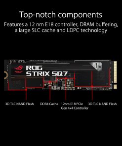 Strix SQ7, süper hizli kararli performans ve daha uzun kullanim ömrü için 12 nm E18 kontrolcü, DRAM tamponlama, genis SLC ön bellek ve Düsük Yogunluklu Eslik Kontrolü (LDPC) gibi özelliklerle donatilmistir.