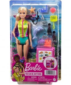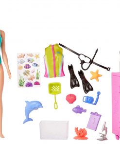 Kutu İçeriği: 1 Barbie bebek, depolama alanı olan 1 taşınabilir bilim laboratuvarı, 1 yüzme yeleği, 1 şnorkel ve bir çift palet, 1 yunus, 1 balık, 1 deniz yıldızı, 1 mercan, 1 deniz kabuğu, 1 akvaryum, 1 ağ, 1 mikroskop, 1 not panosu, 1 fotoğraf makinesi ve 1 çıkartma sayfası dahildir.