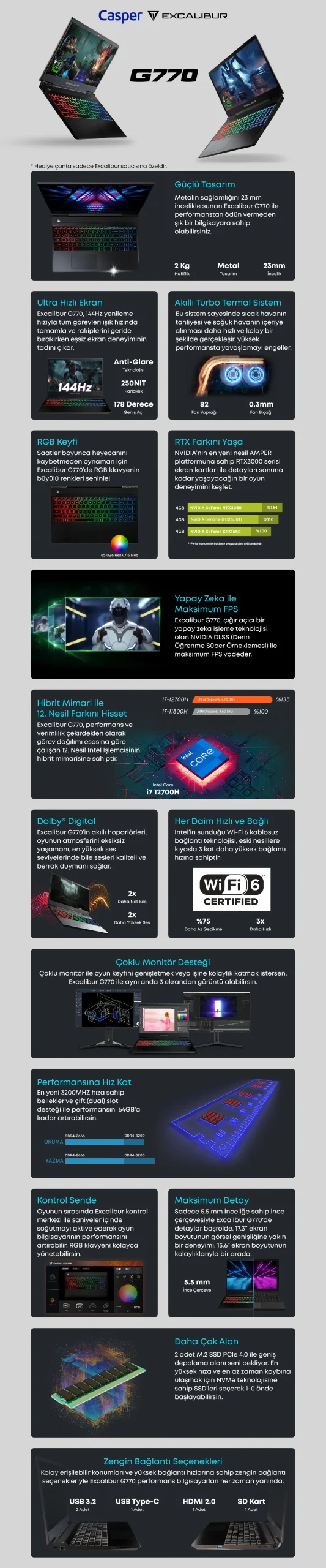 Casper Excalibur G770 Intel Core i7 12700H 16GB 500GB SSD RTX3050 Freedos 15.6" Taşınabilir Bilgisayar G770.1270-BVJ0X-B