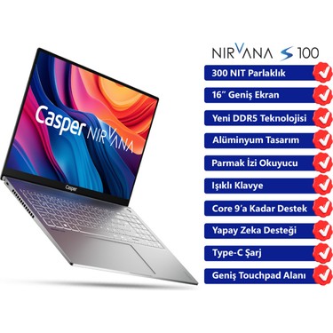 Casper Nirvana S100 300NIT i5-13420H 32GB DDR5 1TB SSD 16" Freedos Laptop S100.1342-DF00X-G-F Casper Nirvana S100 300NIT Core i5-13420H 32GB DDR5 RAM 1TB NVME SSD 16" Freedos Dizüstü Taşınabilir Bilgisayar S100.1342-DF00X-G-F