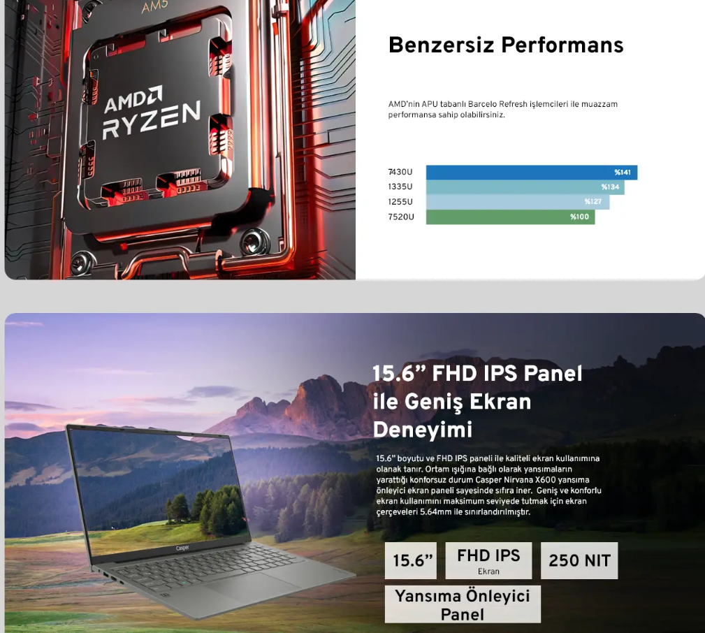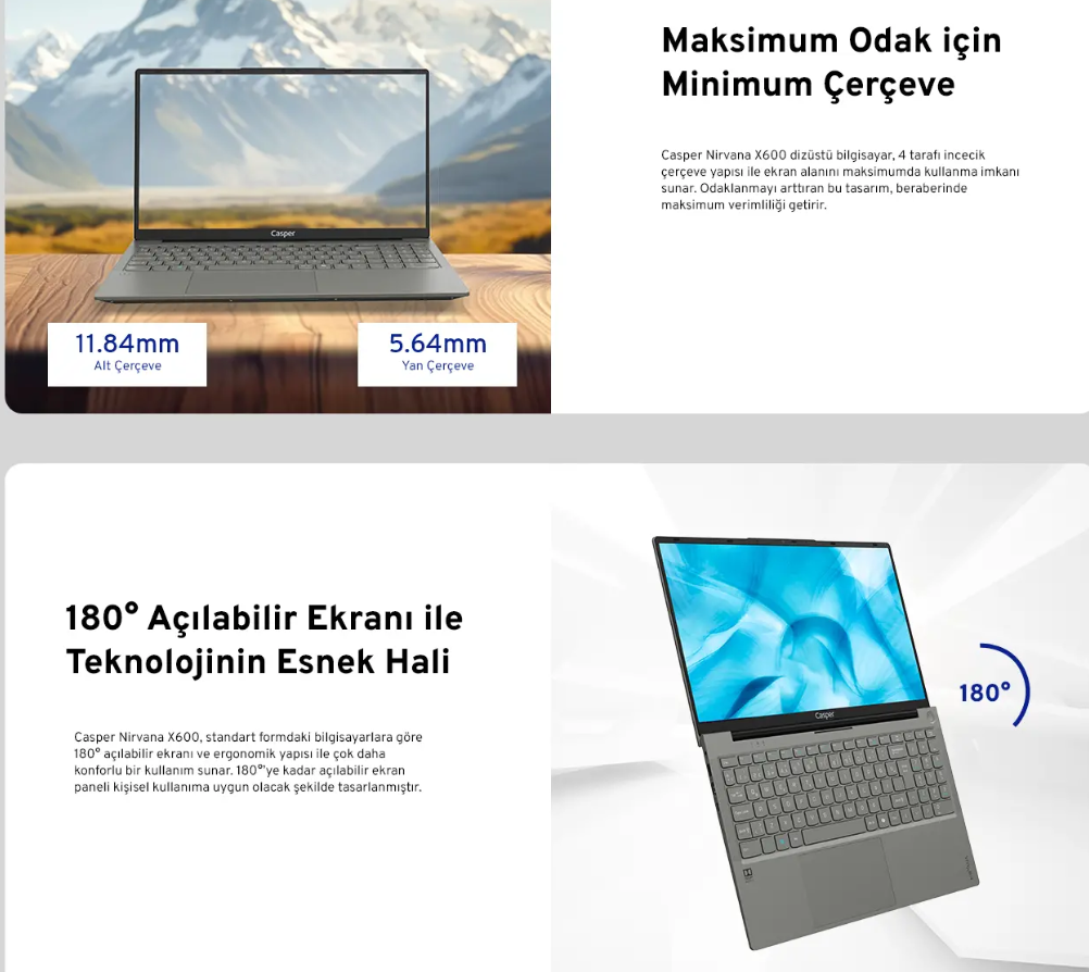 CasperNirvana X600 AMD Ryzen 5 7430U 16GB 500GB SSD Freedos 15.6″ Taşınabilir Bilgisayar X600.7430-BV00X-G-F
