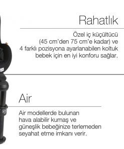 Seat2Fit i-Size, 45-105 cm boylarındaki çocukların kullanımına uygun son ECE R 129/03 standartına sahiptir: 4 yıla kadar güvenlik, konfor ve rahatlığı bir sonraki seviyeye taşır! · EN YENİ i-SIZE ONAYI: ECE R 129/03 standartlarına uygun Seat2Fit i-Size, arabada güvenlik alanında maksimum güvenliği temsil eder. · KURULUM: 45 cm'den 105 cm' e kadar destek ayağına sahip Isofix Sistemi kurulumu ile oto koltuğu kurulumunun güvenli yoludur. · YAN KORUMA SİSTEMİ: Yandan gelebilecek darbe durumunda ek koruma sağlayan Yan Koruma Sistemi şaseye entegre edilmiştir. · KONFOR: İç küçültücü, 4 farklı yatırabilme pozisyonu ile ilk yolculuktan itibaren maksimum konfor elde edilmesini sağlar. (40-75 cm) · DESTEK AYAĞI: Bir çarpışma anında oto koltuğunun öne devrilmesini önler ve maksimum güvenlik sağlar. · BÜYÜME: Baş desteğinin yüksekliği 9 farklı pozisyona ayarlanabilir ve çocuğunuza doğru konfor ve korumayı sağlar. · 360° DÖNEBİLEN SİSTEM: 360° dönebilen sistem ile arkaya dönük konumdan öne dönük konuma kolay geçiş sağlanır. Bebeğin rahatça oturabilmesi için 90° ebeveyne dönük pozisyonda yerleştirme yapılabilir. · YATIRILABİLİR SİSTEM: Arkaya Dönük durumda 1 yatış pozisyonu/ Öne Dönük durumda 4 farklı yatış pozisyonu vardır. · HAVA SİRKÜLASYON SİSTEMİ: Hava akışını maksimuma çıkarmak için Hava Sirkülasyon Sistemi ile tasarlanmıştır. · FIT-KIT: Ürün üzerinde bulunan kolaylıkla okunabilir etiketler sayesinde oto koltuğunun her adımda nasıl kullanılması gerektiği açıklanır. · AKSESUAR: Güneşlik (Yalnızca Air Versiyonunda vardır.) · Yalnızca Air Versiyonunda bulunan özel tasarımı ve 3D kumaş ile sıcak havalarda konforlu seyahat etme imkanı sağlar.
