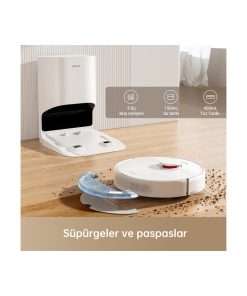 - Beyaz robot süpürge, 270 metrekare alanı kolayca temizler.