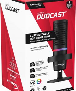 Zarif tasarımlı ve düşük profilli shock mount ve şık RGB ışık halkası içeren HyperX DuoCast oyun oynamak, çalışmak ve içerik oluşturmak için tasarlanmış tam işlevsel bir USB mikrofondur. Diğer HyperX mikrofonlarda bulunan dokunarak sessize alma düğmesi ve canlı LED mikrofon sessize alma göstergesi gibi kullanıcıların sevdiği özellikleri sunar.