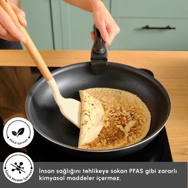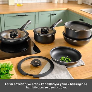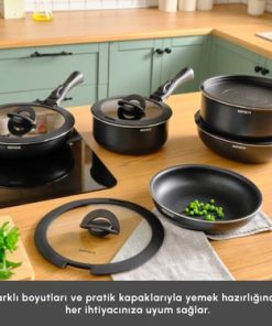 Üstün yanmaz yapışmaz yüzeyi ile et, balık, yumurta ve sebzelerinizi yağ kullanmadan sağlıklı bir şekilde pişirebilirsiniz. Üstelik cam kapakları ile pişme sürecini takip edebilirken, plastik kapaklar ile de yiyeceklerinizi buzdolabında güvenle saklayabilirsiniz.