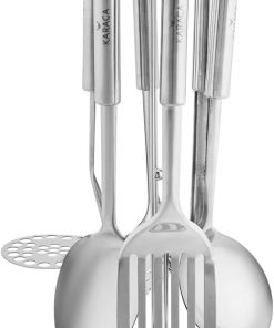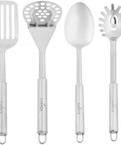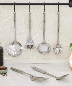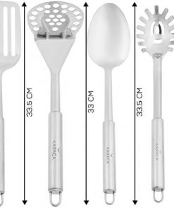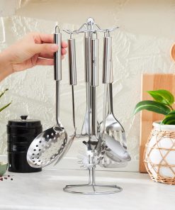 - 1 adet makarna kaşığı 1 adet kevgir 1 adet spatula 1 adet kepçe 1 adet servis kaşığı 1 adet patates ezeceği ve 1 adet servis seti standı