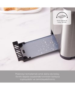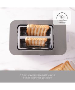 Karaca Dijital Göstergeli Inox Ekmek Kızartma Makinesi Ürün Özellikleri •Karaca Dijital Göstergeli Inox Ekmek Kızartma Makinesi, modern ve kullanımı kolay dokunmatik ekranı ile birlikte dijital göstergesi sayesinde kullanıcı dostu bir deneyim sunar. •Karaca Dijital Göstergeli Inox Ekmek Kızartma Makinesi, etkileyici 850 Watt gücü ile ekmek dilimlerinizin her yerini eşit ve hızlı bir şekilde kızartmalarını sağlar. •Geniş iç tasarımıyla, aynı anda 2 dilim ekmeği rahatlıkla kızartabilirsiniz. •İsteğinize göre ayarlanabilen 7 farklı kızartma seviyesi, kahvaltınızı tamamen sizin damak zevkinize göre düzenlemenizi sağlar. •Durdurma fonksiyonu ile kızartma işlemi devam ederken istediğiniz an işlemi durdurabilir, dilimlerinizi kontrol edebilir ve ardından kızartma işlemine dilediğiniz gibi bitirebilirsiniz. •Buz çözme fonksiyonuyla birlikte hızlı bir şekilde ekmeklerinizin çözülmelerini sağlayabilirsiniz. •Kullanım sonrası oluşan kırıntıları toplamak için özel tasarlanmış kırıntı tepsisi, temizliği son derece pratik hale getirir. •Soğumuş ekmek dilimlerini tekrar sıcak hale getirmek istediğinizde kullanabileceğiniz yeniden ısıtma fonksiyonu, pratik bir kullanım sunar.