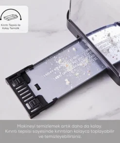 Kullanım sonrası oluşan kırıntıları toplamak için özel tasarlanmış kırıntı tepsisi, temizliği son derece pratik hale getirir.
