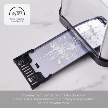 Kullanım sonrası oluşan kırıntıları toplamak için özel tasarlanmış kırıntı tepsisi, temizliği son derece pratik hale getirir.