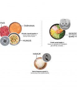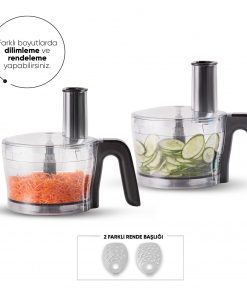 2000W motor gücü ile en iyi ve en hızlı gıda işleme performansını sağlar 1500 ml lik geniş hazneli ile 1,5 kg domatesi tek seferde çekebilirsiniz. Çift katlı, 4 kanatlı doğrayıcı bıçakları üstün doğrama performansı sağlar. Böylelikle humus, salça, kıyma ve tarhana gibi yiyeceklerinizi hızlıca hazırlayabilirsiniz. 2 farklı paslanmaz çelik rende başlığı ile meyve, sebze ve sert peynirleri farklı şekillerde dilim ve rendeleyebilirsiniz Hamur yoğurma aparatı ile kısa sürede homojen hamurlar elde edebilirsiniz. Kaydırmaz ayakları sayesinde çalışma esnasında gövde stabil kalır. Aparatları bulaşık makinesinde yıkanabilir ve pratik şekilde sökülüp takılabilir.
