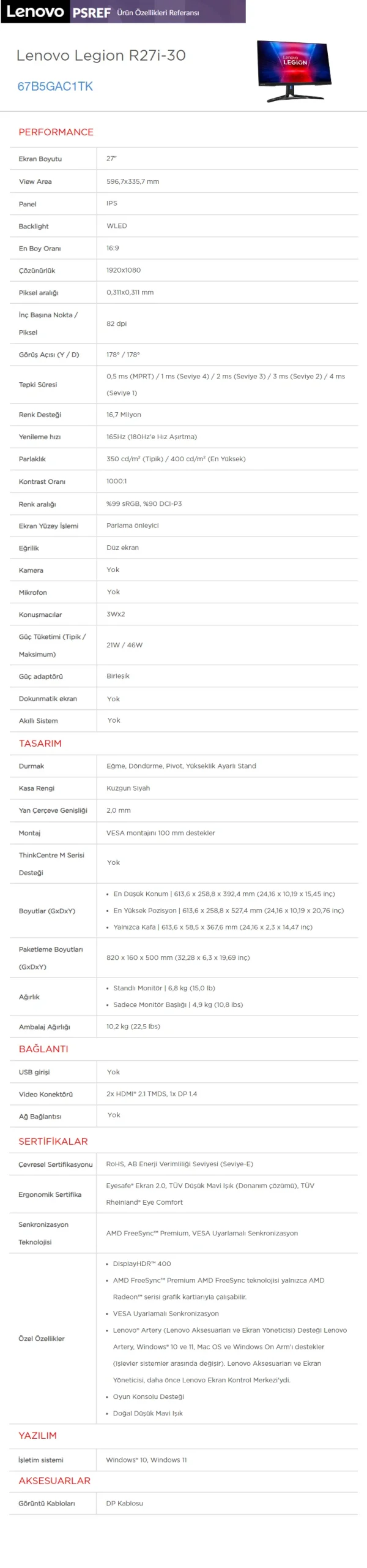 - Lenovo Legion R27i-30 27'' 0.5Ms 165Hz (HDMIx2-Display) AMD FreeSync Premium/VESA Adaptive Sync IPS Panel WLED FHD Gaming Monitör 67B5GAC1TK