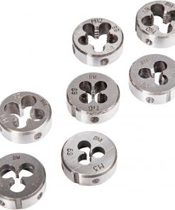 - 7 Adet Yuvarlak Pafta Lokması, Suda Sertleşmiş, Sarsım Dirençli Takım Çeliğinden Mamül: M3, M4, M5, M6, M8, M10, M12