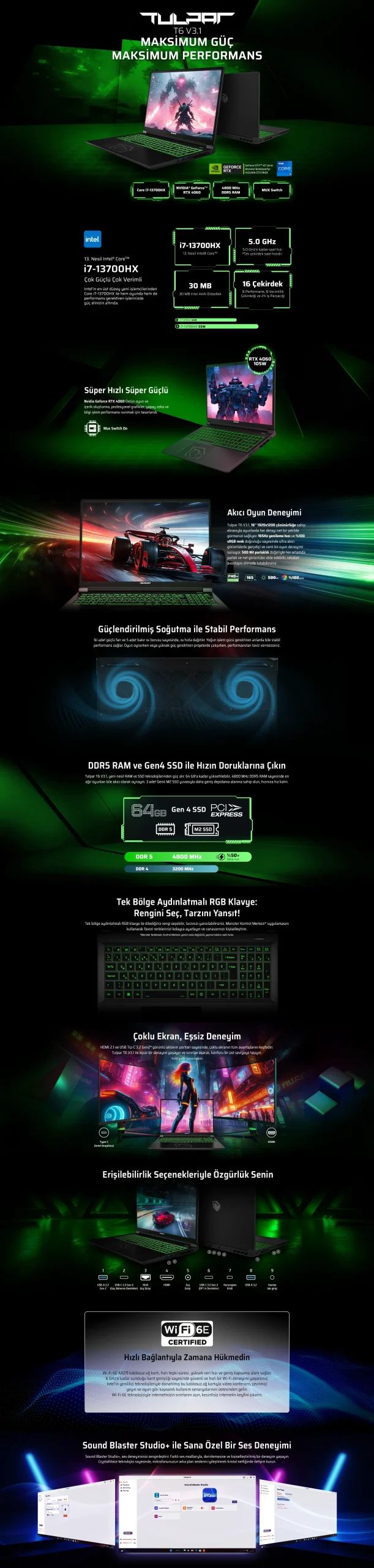 Monster Tulpar T6 V3.1 Intel Core I7 13700HX 16 GB Ram 500 GB SSD 8 GB Rtx 4060 Freedos 16" Fhd 165 Hz Oyun Bilgisayarı ean : 8684308103377