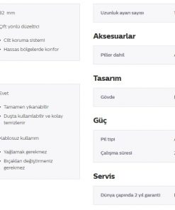 Çift yönlü düzelticiye ve 3 mm tarağa sahip benzersiz tasarım ile farklı yönlerde uzayan tüyleri bile yakalayıp kesmeniz mümkündür. Daha kalın tüyler için tarakla ön düzeltme yapılması önerilir.