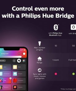 Philips Hue'nin tüm özelliklerini deneyimlemek için akıllı ışıklarınıza Hue Bridge (ayrı satılır) ekleyin. Hue Bridge ile, evinizde kontrol edebileceğiniz 50 adede kadar ışık ekleyebilirsiniz. Akıllı ev aydınlatma sisteminizin tamamını otomatikleştirmek için rutinler oluşturun. Evinizden uzaktayken ışıklarınızı kontrol edin veya hareket sensörü ve akıllı anahtar gibi aksesuarlar ekleyin.