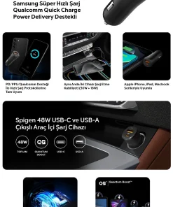 Spigen 48W USB-C ve USB-A Çıkışlı Araç İçi Şarj Cihazı;