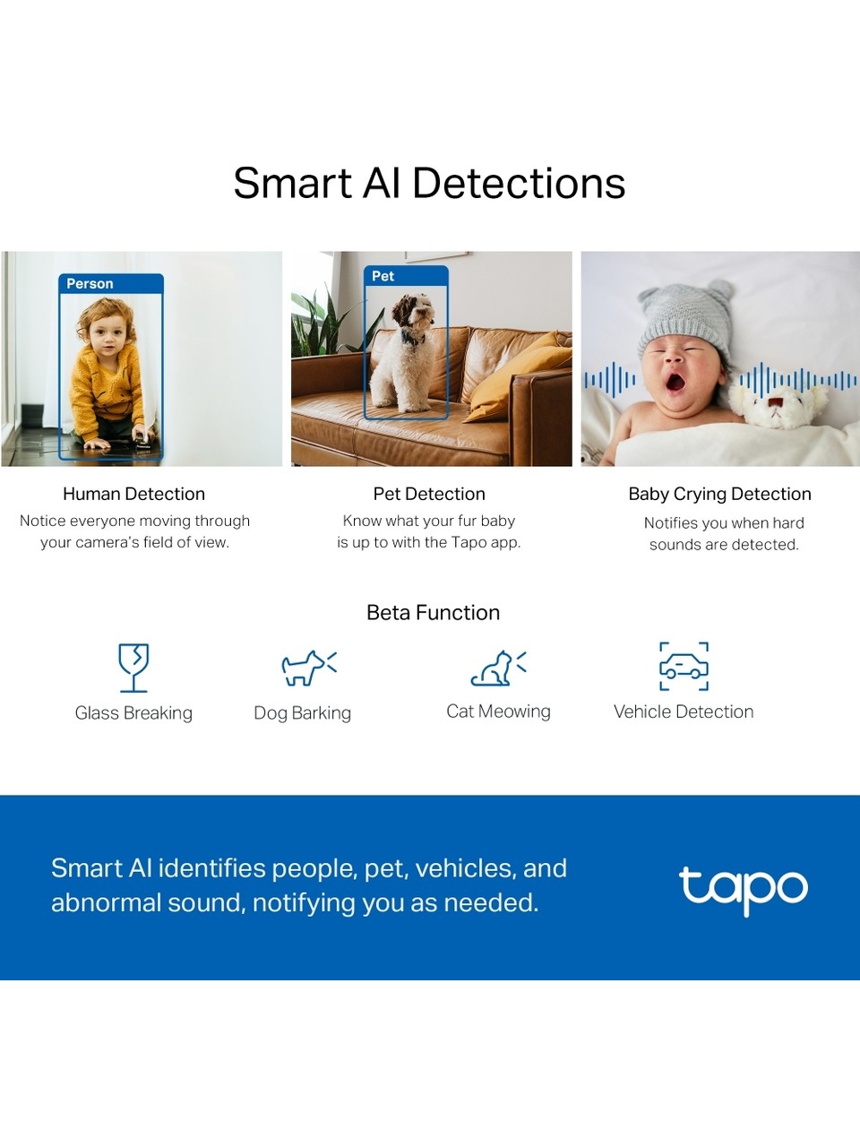 TP-LINK Tapo C220, 2K 4MP İç Mekan Wi-Fi Güvenlik Kamerası, Yapay Zeka Desteği, Hareket Tespit ve Takibi, 360°, 9m Gece Görüşü, Çift Yönlü Sesli İletişim, Bulut/Yerel Depolama, Bebek Ağlaması TespitiAkıllı yapay zeka, insanları, evcil hayvanları ve araçları tanımlarken, bir bebeğin ağlamasını ve diğer sesleri de algılayarak kullanıcıları gerektiği şekilde bilgilendiriyor.