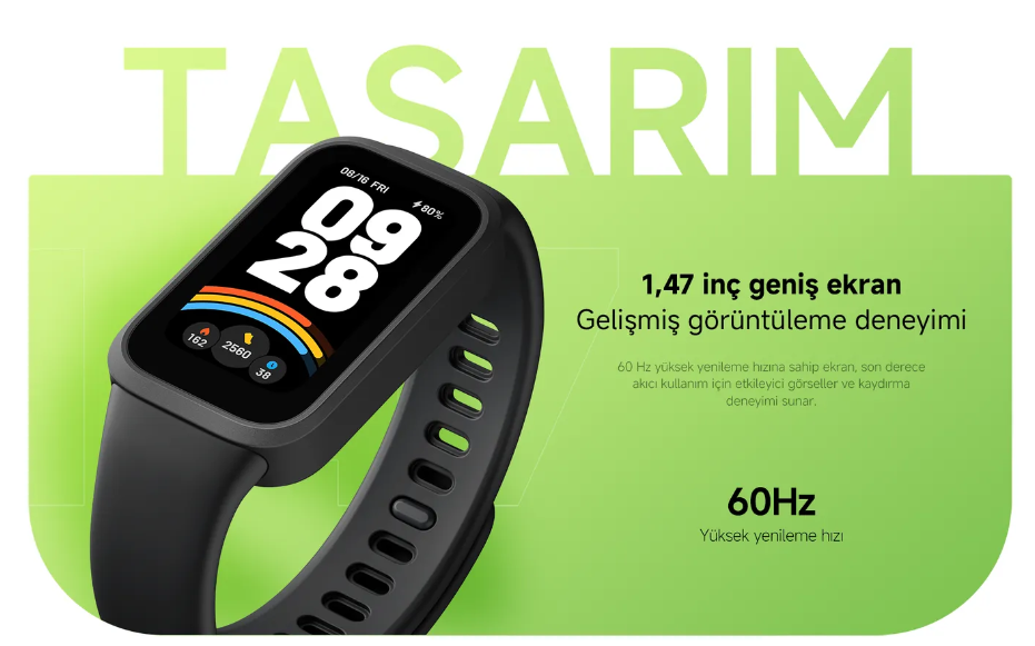 - Xiaomi Band 9 Active • 1,47 inç büyük ekran, bilgileri görüntülemek daha kolay.